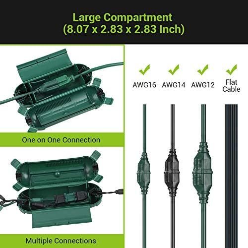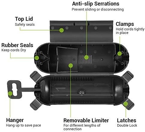 • EASY TO USE: No tools or installation required; place the extension cord properly; slide the limiter to keep cords securely connected; lock the top lid and 4 latches for seal; hanging to save space; ideal for holiday lights, string lights, pool pumps and garden tools etc